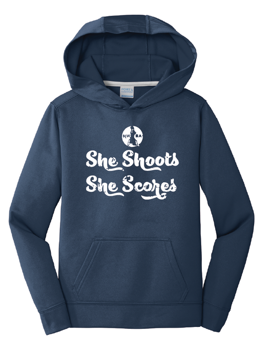 NWBA Officially Licensed - "SHE SHOOTS SHE SCORES" - YOUTH PULLOVER HOODED SWEATSHIRT